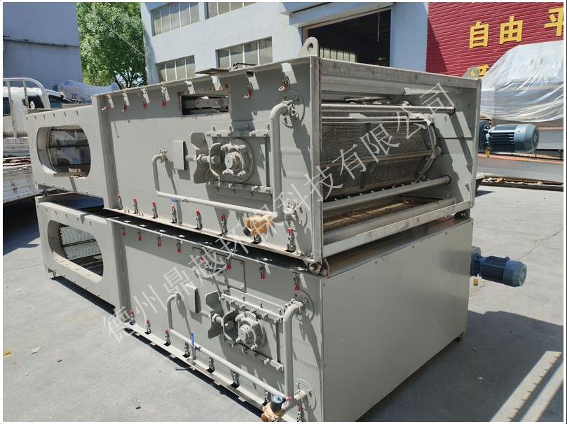 內(nèi)進(jìn)流格柵涂污機(jī)是一種新型的細(xì)格柵清污設(shè)備,采用連續(xù)攔截并清除流體中的固體雜物,可以達(dá)到好的清污效果,如扁平的固體、雜草、瓜殼等,尤其是傳統(tǒng)細(xì)格柵難以攔截的毛發(fā)纖維類污物,可大大降低后續(xù)處理工序的負(fù)荷。內(nèi)進(jìn)流式格棚主要由驅(qū)動(dòng)裝置、機(jī)架、牽引鏈條、提升的網(wǎng)板、沖中洗系統(tǒng)及電氣控制柜等主要部件組成。機(jī)架安裝于格柵渠的,機(jī)架兩側(cè)與格柵渠之間的間隙為格柵濾后出水的通道。在機(jī)架的迎水端兩側(cè)與渠壁間布置了導(dǎo)流擋板,其在導(dǎo)流的同時(shí),可防止污水短流由濾前直接進(jìn)入濾后。機(jī)架下部迎水端開有一個(gè)進(jìn)水洞口,其對(duì)側(cè)為封閉端。